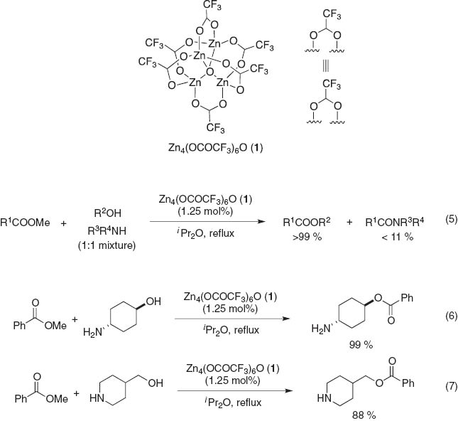We reported that the zinc cluster Zn4(OCOCF3)6O (1) [15] effectively catalyzes the hydroxy group-selective acylation with unactivated methyl esters in the presence of primary and secondary aliphatic amino groups (eq. 5) [15b]. The present method provides a new protocol to directly convert amino alcohols to the corresponding amino esters without the use of protecting groups, outlined in Fig. 2a. Representative examples are the transesterification of methyl benzoate with amino alcohols such as trans-4-aminohexan-1-ol and 4-piperidinemethanol to give the corresponding amino esters without any amides (eqs. 6 and 7), while ethanolamine and cis-4-aminohexane-1-ol predominantly produce the corresponding amides via intramolecular O,N-rearrangement of the initially generated amino esters. In addition, under refluxing conditions in excess amounts of EtOAc, the alcohols are acetylated in high yield while hydroxyl group selectivity is maintained [15d].