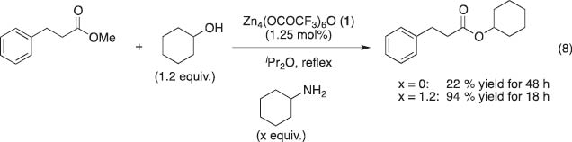 The addition of catalytic amounts of amines and N-heteroaromatics to zinc catalyst 1 has drastic additive effects on the transesterification of alcohols to increase the catalytic activity compared with the original reactivity of 1. A typical example is shown in eq. 8: in the presence of cyclohexylamine, transesterification proceeds smoothly to reach 94 % yield while maintaining the O-selectivity [15h]. DMAP works better than primary amines, facilitating the transesterification of sterically demanding esters and alcohols (Scheme 3). In fact, in the presence of a catalytic amount (20 mol%) of DMAP, transesterification of methyl adamantine-1-carboxylate and 1-butanol under toluene refluxing conditions for 90 h affords 94 % yield, which is greatly improved compared with only a trace amount obtained with no additive and 29 % yield by the addition of cyclohexylamine. We propose that the addition of DMAP stabilizes the clusters with lower nuclearities and enhances catalytic activity for transesterification.
