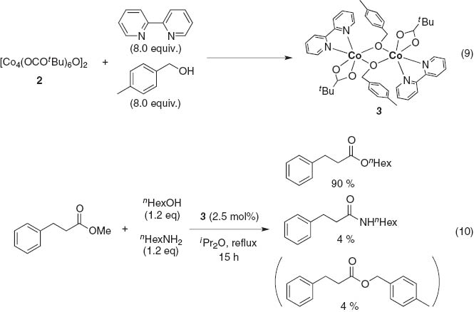 We selected a pivalate-bridged octanuclear cluster, Co8(OCOtBu)12O2 (2)[16], to elucidate O-selective transesterification [15i]. Ligand screening revealed that not only monodentate amines and N-heteroaromatics, but also chelating ligands, including acyclic and cyclic ligands, have suitable additive effects, and finally we selected 2,2′-bipyridine. The reaction of 2 with 2,2′-bipyridine (8 equiv) in the presence of 4-methylbenzyl alcohol (8 equiv) afforded an alkoxide-bridged dinuclear complex Co2(OCOtBu)2(bpy)2(μ2-OCH2-C6H4-4-CH3)2 (3) as a key intermediate (eq. 9), which we characterized by X-ray analysis. Notably, the isolated complex 3 showed hydroxyl group selectivity: competitive reaction of methyl 3-phenylpropanoate with a 1:1 mixture of n-hexanol (1.2 equiv) and n-hexylamine (1.2 equiv) in the presence of 3 (2.5 mol%) produces esters (totally 94 %) and an amide (4 %) (eq. 10).