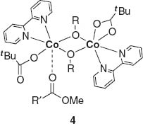 Kinetic studies and DFT calculations revealed Michaelis–Menten behavior of the complex 3 through the ordered ternary complex mechanism similar to dinuclear metallo-enzymes, suggesting the formation of alkoxides followed by coordination of the ester to give the ternary intermediate 4 with η1-coordination of the pivalate moiety and intramolecular nucleophilic attack of the bridged alkoxy moiety to the coordinated ester. In contrast to the Co(II) ion of the active species, Co(III) compounds have very low catalytic activity due to the inertness of a closed-shell d6 Co(III) species for any ligand exchange reaction. We therefore assumed that basic μ-oxo moieties of the cobalt cluster play an important role in the initial deprotonation step of alcohols for producing alkoxo-bridged species.