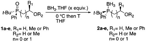 In the Table 1, we summarized the results obtained on the reduction of hydroxyalkyl functionalized phosphine oxides (TPO) 1 to hydroxyalkyl functionalized tertiary phosphine–boranes (TPB) 2. We first studied the influence of the amount of BH3·THF on the conversion of the TPO 1a. It appeared clearly that 3 equivalents are sufficient to afford completely the TPB 2a (Table 1, entries 1–3). Nevertheless we also observed the full conversion of 1a with only 0.33 equiv. of BH3.THF, followed by its recovery after hydrolysis (entry 1). The importance of the hydroxyl group was highlighted as the methyl ether 1b failed to react while being placed with 6 equivalents of BH3·THF for 2 weeks (entry 4). The stereospecificity of the reaction was also demonstrated. Indeed enantioenriched TPO 1a–e were reduced to TPB 2a–e with weak loss of enantiopurity (entries 5–8). The reduction occurred with inversion of configuration at the phosphorus atom as demonstrated by XRD and VCD [16]. The influence of the intramolecular distance between the P=O and the OH groups has been evidenced by the difference of reactivity of the TPO 1a and 1c. For the latter (n=1), the reaction mixture has to be warmed to 50°C for 72 h to get the TPB 2c in only 56% yield (entry 6). The substitution on the α-position of the P=O bond with a methyl (entry 7) and a phenyl group (entry 8) afforded lower yields, given that a small amount of secondary phosphine-boranes (SPB) is isolated along with the desired product.