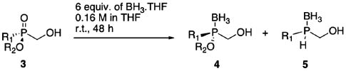 Once the preparation of (O-adamantyl)hydroxymethylphosphinate 3a, c–e [17] and (O-menthyl)hydroxymethylphosphinate 3b [18] have been realized, their reduction with 6 equivalent of BH3·THF gave the desired product 4 with satisfactory yields with respect to the selectivity of the reaction. As observed for the phosphine oxides 1, the reduction of phosphinates occurred with inversion of configuration at the phosphorus atom.