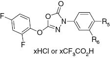 [27] Typical procedure: 5-(2,4-difluorophenoxy)-3-(4-(2-(piperazin-1-yl)ethoxy)phenyl)-1,3,4-oxadiazol-2(3H)-one dihydrochloride (24). tert-Butyl 4-(2-(4-(5-(2,4-difluorophenoxy)-2-oxo-1,3,4-oxadiazol-3(2H)-yl)phenoxy)ethyl)piperazine-1-carboxylate (5) (6 g, 11.6 mmol) was added in portions to TFA (280 mL) with stirring at 20–25°C. The mixture was stirred for 1 h and TFA was removed under reduced pressure. The oily residue was re-evaporated twice with toluene (ca. 100 mL), then dissolved in EtOAc (120 mL), and cooled to 0–5°C, whereupon 2 M ethereal hydrogen chloride solution (25.5 mL, 51 mmol) was slowly added causing precipitation. The solid was collected, washed with diethyl ether and anhydrous EtOH and dried under vacuum at 45°C to give a white powder. Yield 3.62 g (64%).Search in Google Scholar
