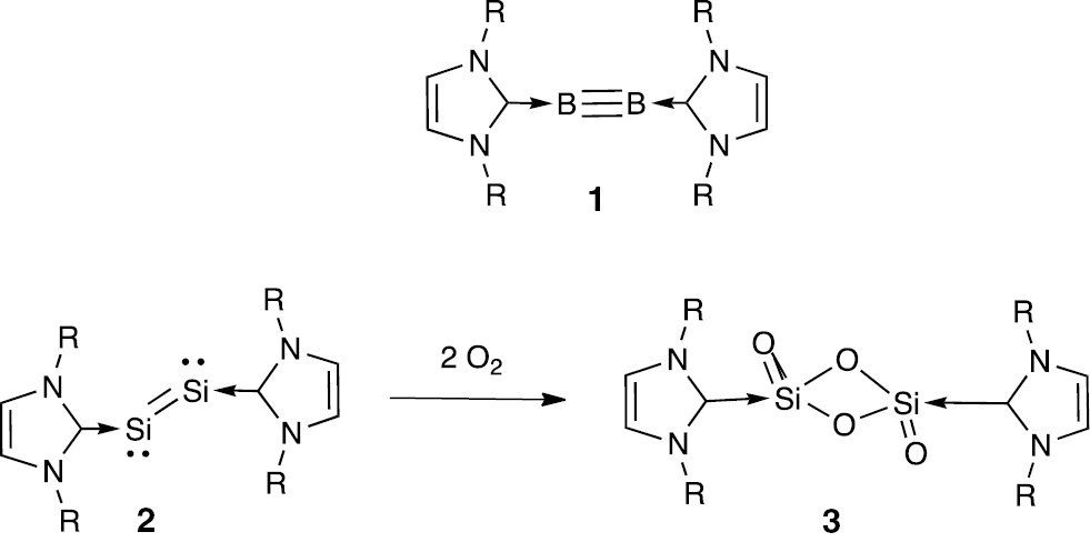 The use of ligands such as N-heterocyclic carbenes (NHCs) to stabilize small p-block fragments in the formal 0 oxidation state continues to be an area of major interest. These electron rich complexes display unique bonding, reactivity and properties. The recent literature is too extensive to properly treat in this forum (see these reviews) [1], [2], [3], but two particularly striking examples were the isolation of NHC stabilized B2 (1) [4], displaying the first reported B–B triple bond, and the O2 oxidation of NHC stabilized Si22, which gave a formal SiO2-NHC complex (3) – a form of sand soluble in organic solvents [5].