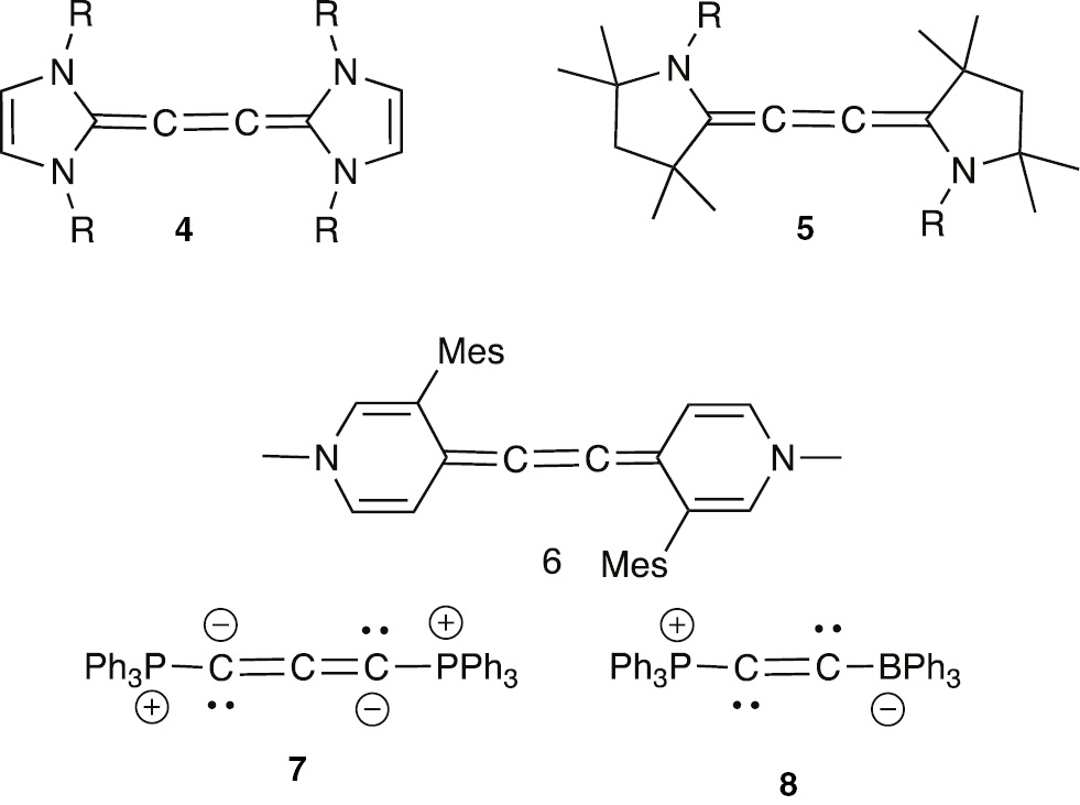 Our group proposed NHC stabilized C24 as an interesting target in 2012 in a theoretical paper predicting that this compound would exist as a cumulene, but act as a strong bifunctional ligand via the central carbon atoms [15]. Bertrand [16] and Roesky [17] shortly thereafter independently synthesized a related compound using cyclic alkylaminocarbene (cAAC) ligands (5), confirming the predicted cumulene structure. Kinjo and co-workers synthesized a C2 cumulene in which the 4-position of two pyridinium rings act as carbenes with respect to the central C2 unit (6) [18].