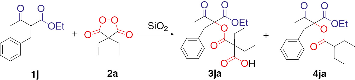 SiO2-mediated oxidative coupling of ethyl 2-benzyl-3-oxobutanoate 1j with diethylmalonyl peroxide 2a.