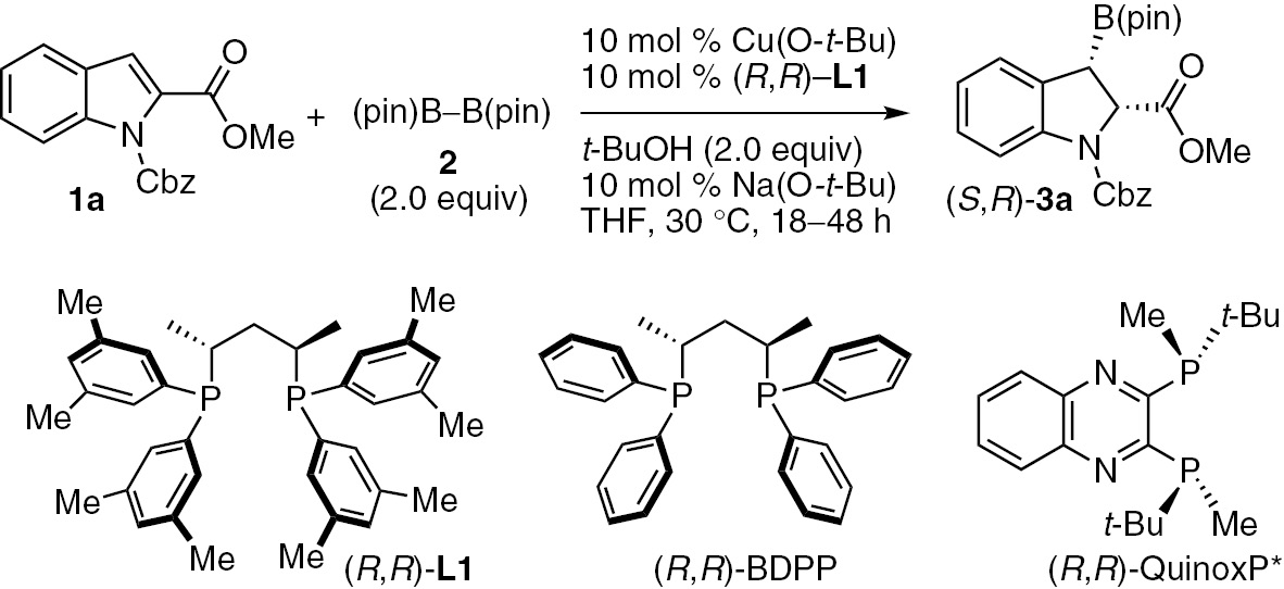 We envisioned that asymmetric dearomatization of indole derivatives will be a powerful method to access indolines and other heterocyclic compounds [27], [28], [29]. The optimization experiments revealed that the reaction of carboxybenzyl (Cbz)-protected methyl indole-2-carboxylate (1a) with bis(pinacolato)diboron (2) (2.0 equiv) in the presence of Cu(O-t-Bu)/(R,R)-L1 (10 mol%), Na(O-t-Bu) (10 mol%) and t-BuOH (2.0 equiv) in THF at 30°C afforded the desired dearomatization product (S,R)-3a in high yield (98%), with excellent diastereo- and enantioselectivities (d.r. 97:3, 93% ee, Table 1, entry 1). Notably, no product was observed when the reaction was conducted in the absence of Cu(O-t-Bu) or the chiral ligand L1 (Table 1, entries 2 and 3). A lower yield (74%) of the dearomatization product 3a was obtained when Na(O-t-Bu) was omitted from the reaction (Table 1, entry 4), although the absence of t-BuOH led to a significant decrease in the yield and stereoselectivity of the product (33%, d.r. 76:24, 74% ee) (Table 1, entry 5). Less sterically hindered (R,R)-BDPP ligand resulted in a lower enantioselectivity (74% ee), which indicated that the nature of the substituent on the phenyl group of the ligand played an important role in the high enantioselectivity of the reaction (Table 1, entry 6). (R,R)-QuinoxP*, which showed excellent results in many enantioselective borylations [4], resulted in inferior results in terms of enantioselectivity (Table 1, entry 7). The diastereoselectivity of B(pin) and the ester group was syn because of the protonation occurred from the enolate intermediate so as to avoid the steric hindrance of B(pin) and the alcohol [24]. Several other chiral bisphosphine ligands were also tested in the reaction, but they only showed inferior results compared to that of entry 1.
