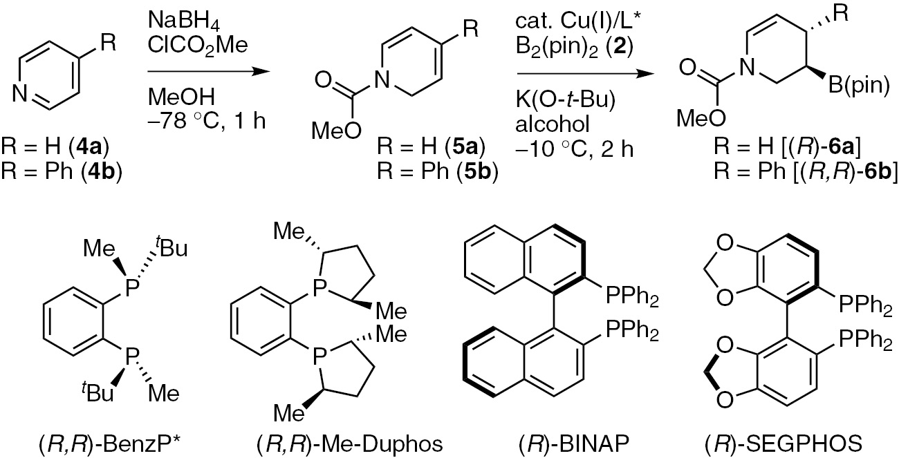 Sequential asymmetric dearomative borylation of pyridine derivative 4a and 4b.