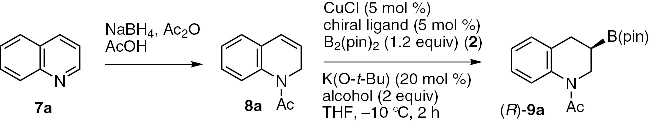 The dearomative borylation of quinoline is also attractive target; [35], [36], [37], [38], [39], [40], [41], [42] however, same as the pyridine case, the direct borylation of quinoline failed. Optimization experiments for the dearomatization sequential procedure revealed that the reaction of N-acetyl 1,2-dihydroquinoline 8a which was prepared through the NaBH4 reduction of quinoline (7a) [11], with bis(pinacolato)diboron (2, 1.2 equiv) in the presence of CuCl/(R,R)-QuinoxP* (5 mol%), K(O-t-Bu) (20 mol%) and MeOH (2.0 equiv) in THF at 10°C afforded the desired chiral 3-boryl-tetrahydroquinoline (R)-9a in high yield (90%) with excellent enantioselectivity (98% ee) (Table 3, entry 1). The use of (R,R)-BenzP* or (R,R)-Me-Duphos instead of (R,R)-QuinoxP* also provided high levels of enantioselectivity (Table 3, entries 2 and 3, 97% ee and 95% ee, respectively). Contrary, lower chemical yields and enantioselectivities were observed when a triarylphosphine-type ligand, such as (R)-BINAP or (R)-SEGPHOS was used (Table 3, entries 4 and 5). Several other chiral ligands, including (R,R)-BDPP and (R,S)-Josiphos, were also screened in the reaction. Although these ligands both provided the desired borylation product, they afforded only poor enantioselectivities (Table 3, entries 6 and 7, –14% ee and –29% ee, respectively).