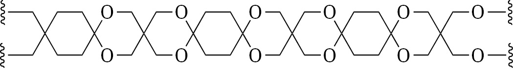 contains two types of rings, namely two 1,3-dioxane rings (in opposing orientation) and a cyclohexane ring. The preferred CRU retains the two 1,3-dioxane rings, and the carbocycle is broken (see criterion 2 above). The acyclic fragments are placed to the right of the heterocyclic ring system (see criterion 6 above).
