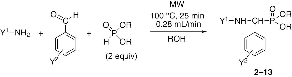 Continuous flow MW-assisted Kabachnik-Fields reaction of primary amines with benzaldehyde derivatives and dialkyl phosphites.