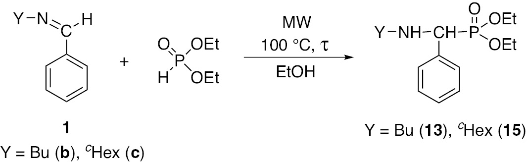 In order to avoid the formation of the unreactive α-hydroxyphosphonate 14 and to synthesize the α-aryl-α-aminophosphonates (13 and 15) selectively, we changed for the aza-Pudovik reaction of N-benzylidenebutylamine (1b) and N-benzylidenecyclohexylamine (1c) with DEP in ethanol in a continuous flow MW reactor (Table 5). First, the imine 1b was reacted with two equivalents of the DEP at 100°C using a residence time of 20 min (at a flow rate of 0.35 mL/min), and product 13 was formed with a conversion of only 52% (Table 5/Entry 1). Increasing the excess of the DEP to 2.5 equivalents, the conversion was 26% higher (78%) (Table 5/Entry 2). Performing the addition with longer residence time, such as 30 or 40 min (flow rates of 0.25 or 0.18 mL/min), the conversions were similar, and 90% of the α-aryl-α-aminophosphonate (13) was formed (Table 5/Entries 3 and 4). For a complete conversion, the use of three equivalents of the DEP was necessary at a flow rate of 0.25 mL/min (residence time of 30 min) (Table 5/Entry 5). From the mixture obtained, the diethyl ((butylamino)(phenyl)methyl)phosphonate (13) could be isolated in a yield of 90% after purification. The aza-Pudovik reaction of N-benzylidenecyclohexylamine (1c) was carried out under similar conditions, and the corresponding α-aminophosphonate (15) was obtained in a yield of 92% (Table 5/Entry 6).