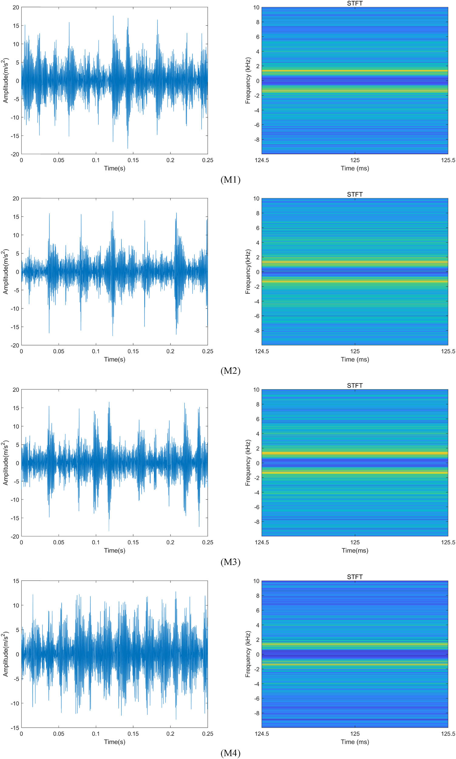 Therefore, the STFT that is more suitable for analyzing the time–frequency characteristics of diesel engine fault signals is selected to generate time–frequency image samples. The basic idea of STFT is to localize the integration interval of the FT of the time-domain signal of the device. Suppose there is a continuous signal y(t), which can be expanded in the complete quadrature signal space as [37],