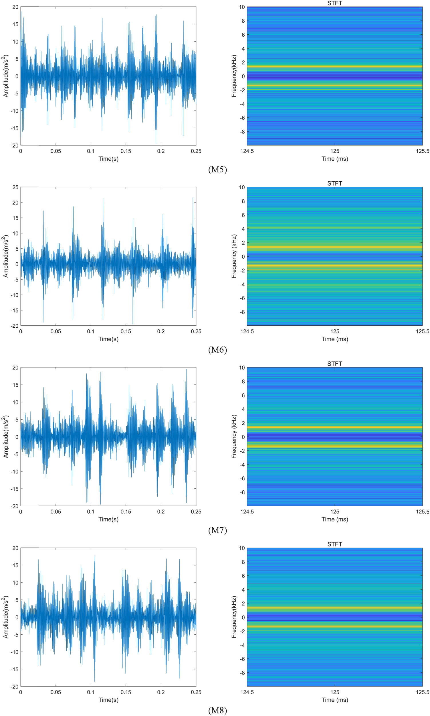 After the conversion and effect analysis of the sensor data in the early stages, it was decided to select the fifth channel signal for research in the experiment. The sample point number was 5,000, and each of the eight types took 55 samples. The vibration signals and STFT time–frequency diagrams under eight types of faults are shown in Figure 10. It can be seen that there are subtle differences between the signals of different types of faults, whether it is the time-domain diagram or the STFT time–frequency diagram. But it is still unable to directly judge the fault type. Therefore, it is necessary to rely on the powerful feature extraction and learning capabilities of the deep learning model to realize the classification and identification of diesel engine hybrid fault states.