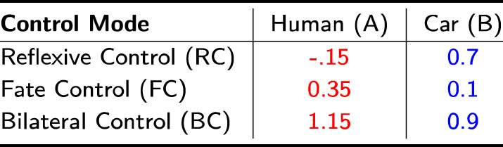 If the signs of BC A and BC B are the same, as in the example, they are said to correspond, signaling that both actors share a preference for coordinated behavior. If the sign of BC matches that of RC or FC, they are said to be concordant, and if not, they are discordant. Concordance (discordance) is a measure of reinforcement (interference) between one mode of control and another. As the autonomous vehicle’s interdependence weights in our example are all positive, FC B , RC B , and BC B are all concordant, whereas for the human, FC A and BC A are concordant, but RC A is discordant with both, signifying that the human is being coerced (in this case through incentivization). Both BC A and BC B are positive and thus correspond, indicating that the human and car share a preference for coordination.