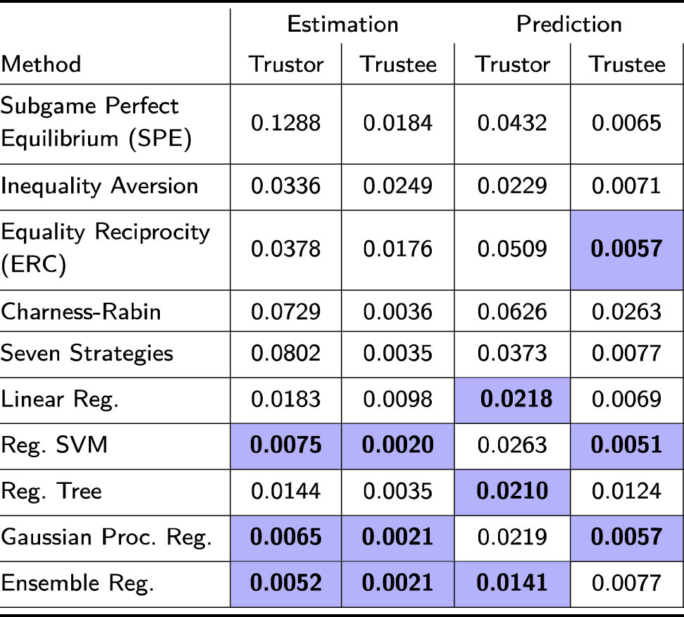 It is a well-known phenomenon that, even in the “toy problems” presented in game theory experiments, people choose to trust and be trustworthy more than they seemingly “should” based on payoffs and risk aversion alone [2]. Theories as to why people “over-trust” range the gamut from long-term reputation keeping, conformity to moral norms, expecting and reciprocating kindness, guilt, and inequality aversion to name but a few, with varying supporting findings in the game-theoretic trust literature [2,38,39, 40,41]. Note that these theories all fall under the “broader” notions of structural or relation-based trust, as discussed in Section 1.1.