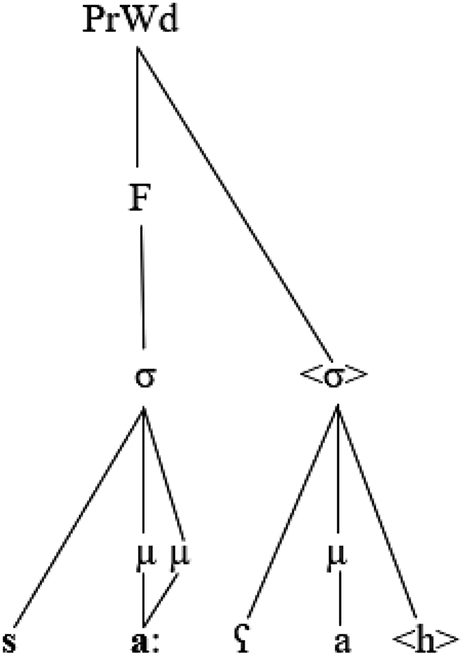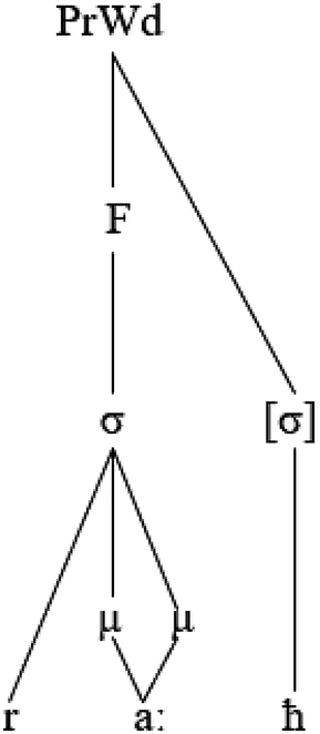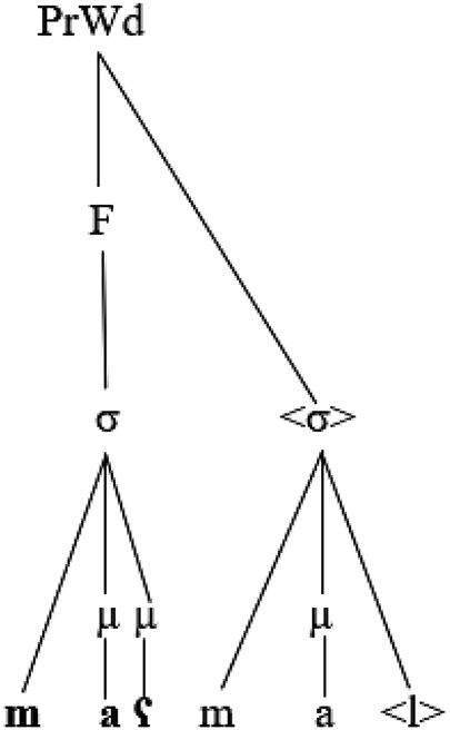 The SLH, a fundamental and widely recognised concept in linguistics, is a term that is used to encapsulate the idea that a prosodic constituent structure is meticulously organised based on the ordered set of prosodic category types in the prosodic hierarchy shown above (Itô 1986; Nespor and Vogel 1986; Selkirk 1984, 2011). Rakhieh (2009: 175) emphasised the importance of the SLH by stating that it “demands that every non-highest prosodic element be in its entirety a constituent belonging to the next highest category on the prosodic hierarchy”. In the context of the representation in (10) above, a semisyllable violates the SLH due to the directed link to the prosodic word. Alqahtani (2014) pointed out that a semisyllable above was not linked to a syllable or to a foot. Kiparsky (2003) and Watson (2007) proposed two solutions to link a semisyllable above to a syllable node, namely vowel epenthesis and mora sharing. Alqahtani (2014) suggested that a semisyllable found in a non-final CVVC could be affiliated to the syllable node via mora sharing to conform to the ban on trimoraic syllables and the SLH. Consider the following representation: