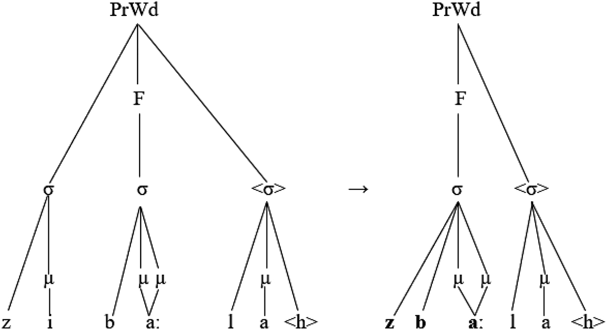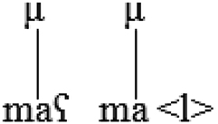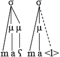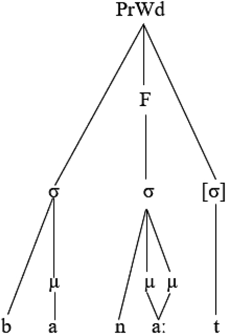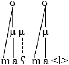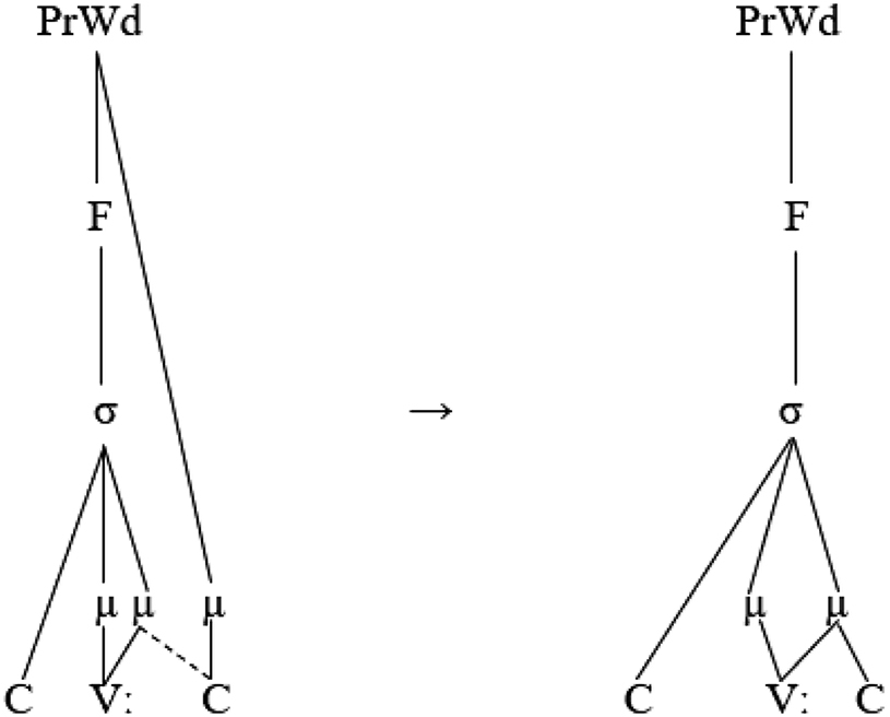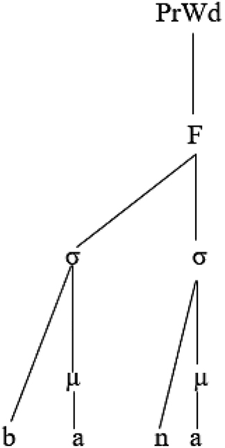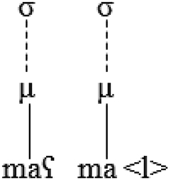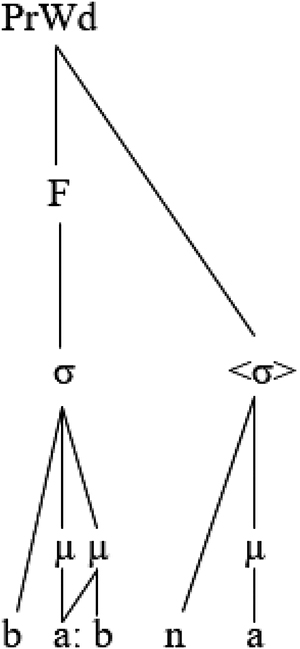 The following representation of the output [baːµµb. naµ] ‘our door’ shows how mora sharing serves to affiliate a semisyllable to the syllable node: