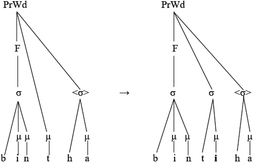 The CVCC syllable is limited to the final position if the word-final cluster adheres to the crucial sonority sequencing principle (SSP). If not, the word-final cluster is split by vowel epenthesis (Alqahtani 2014). In addition, the non-final CVCC is avoided by vowel epenthesis rather than by mora sharing to affiliate a semisyllable to a syllable node (Alqahtani 2014; Alshammari 2023), as demonstrated in the representation of the output [ˈbiµnµ.t i µ.haµ] ‘her daughter’: