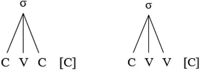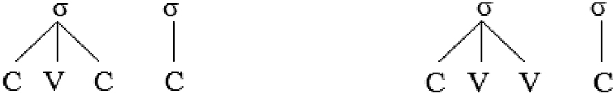 CCVC, CCVV, CCVVC, and CCVCC are derived from deleting the unstressed high short vowels in the non-final open light syllables (Alqahtani 2014; Alshammari 2023). CCVC and CCVV are restricted to non-final positions in disyllabic words, while CCVVC and CCVCC are only found in monosyllabic words (Alqahtani 2014; Alshammari 2023). Consider the following representations: