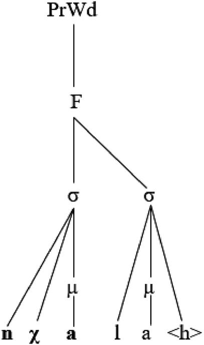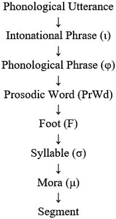 A semisyllable in the representation (11) violates the Strict Layer Hypothesis (SLH). To demonstrate the SLH, it is essential to illustrate the prosodic hierarchy and to then indicate the SLH to show how a semisyllable in the above representation is a mismatch with the SLH. Selkirk (1984, 2011), Nespor and Vogel (1986), and Roca (1994) unanimously agreed that prosodic hierarchy was an ordered set of prosodic category types. Selkirk (2011: 437) added that “these prosodic categories constitute possible node labels for prosodic structures and in the standard view are stipulated by phonological theory”. Consider the following prosodic hierarchy:
