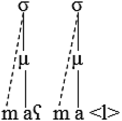 However, mora sharing does not apply to CVVC and CVCC in the final position (Alqahtani 2014). The coda in final CVVC and CVCC is treated as extrasyllabic because it is not within the syllabic domain; that is, it is peripheral (Hayes 1995; Kager 1995; Kenstowicz 1994; Kiparsky 2003).[4] Consider the representation of [raːµµ. ħ] ‘he was gone’ and [baµrµ.d] ‘cold’.