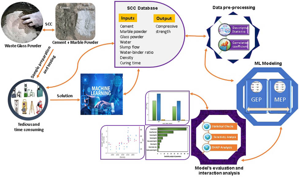 This study aims to develop prediction models for the CS of waste glass and marble-based SCC using ML methods. Traditional experimental procedures to determine SCC properties require significant financial investment, time commitment, and physical effort due to the complex procedural requirements. These requirements include acquiring the necessary ingredients, casting the samples, curing the samples to achieve their strength, and conducting the subsequent testing phase. By applying sophisticated modeling techniques, such as ML, the construction industry may be able to alleviate these obstacles and gain substantial benefits. Therefore, GEP and MEP are utilized because of their advantage in yielding mathematical expressions to accomplish the research objective. The evaluation of each model’s approximation accuracy is performed by executing statistical tests and comparing the predicted outcomes to the true test results. Additionally, sensitivity analysis and SHapley Additive exPlanations (SHAP) analysis are conducted to examine the impact and interaction of input parameters on the model predictions. The database necessary for ML techniques can be acquired through laboratory experiments or scholarly literature. Consequently, the dataset may be applied to the execution of ML algorithms, prediction of material characteristics, and relative effects analyses. An experimental dataset is utilized in this research to evaluate the efficiency of GEP and MEP ML methods in forecasting the SC of SCC. The outcomes of this research may aid researchers and relevant industries in optimizing the mix design of SCC and eliminate repeated experimental processes.