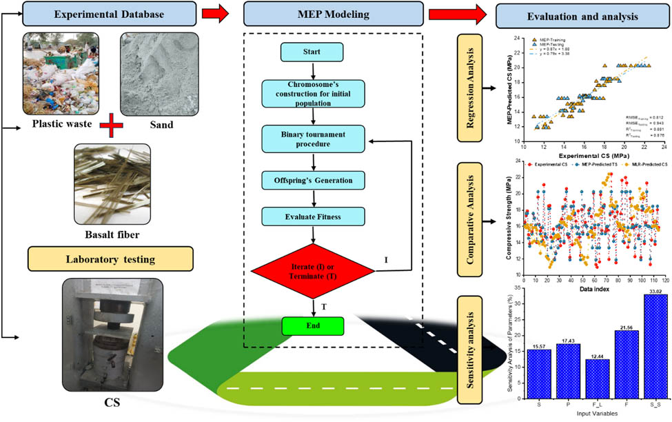 Considering the benefits of MEP and the drawbacks of other ML models, this study employed the MEP technique for estimating the CS of PSPB. To the best of the author’s knowledge, no studies have explored the use of both experimental and ML techniques to evaluate the CS of PSPB with basalt fiber as an additive. In the past, only experimental investigations or simple mathematical models were used, requiring a substantial investment of time and financial resources. Therefore, for the first time, this study integrates the experimental findings with MEP-based models to estimate and provide predictive equations for CS of PSPB. First, experimental examinations were performed to assess the CS of PSPB. Varied mix proportions of plastic and sand with different sizes of sand were employed. Subsequently, an extensive experimental record was established, and the MEP technique was used to forecast the CS of PSPB. Various statistical methods and PA and SA were performed to assess the models’ effectiveness. This study aims to provide a sustainable alternative to cement by experimentally investigating the use of PW instead of cement and providing an MEP-based simplified equation that can be applied in practice for pre-design purposes of PSPB.