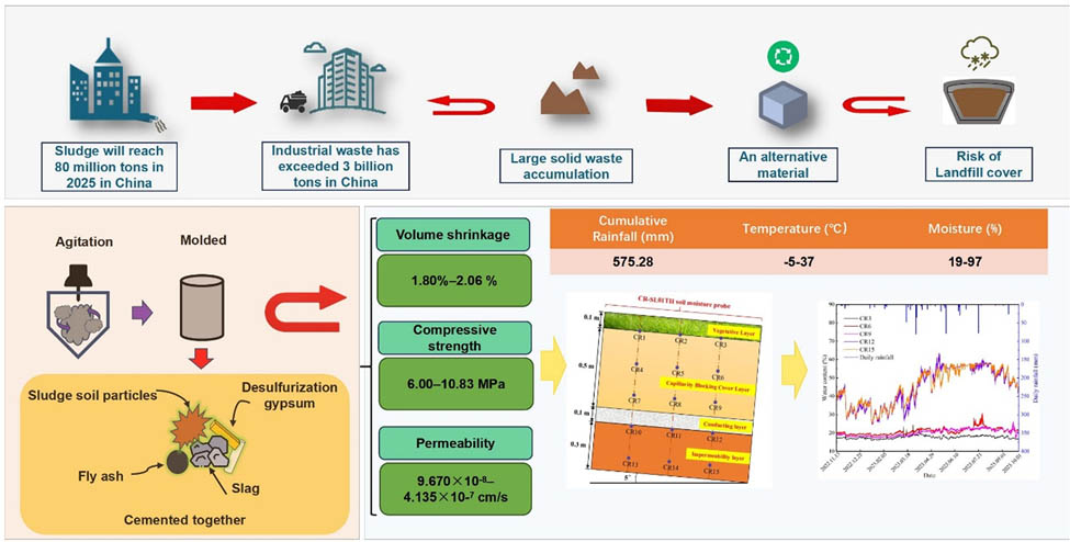 China’s solid-waste stockpile reached ∼60 billion tons by 2018 (≈2 million ha), comprising 20 billion tons construction and 30 billion tons industrial residues; annual generation now exceeds 4 and 3 billion tons, respectively. About 11,000 wastewater treatment plants further yield >60 million tons per·year of municipal sludge (MS) [1], which produced over 60 million tons of MS in 2021. Projections indicate that China’s annual production of MS will exceed 80 million tons by 2025 [2]. Solid wastes contain significant amounts of nutrients, organic matter, heavy metals, and viruses, posing a serious threat to human health and ecological balance [3–5]. The National Soil Pollution Survey Bulletin identifies 188 solid waste disposal sites, noting that up to 21.3% exceed pollutant thresholds. However, the utilization rate of solid waste resources in China remains notably low, with the comprehensive utilization rate of general industrial solid waste at approximately 60% and that of construction and demolition waste merely 10%. Despite the increasing use of industrial waste and MS as landfill covers [6], there are still key gaps. The freeze-thaw (F-T) durability data of multi-source solid waste geopolymers are limited [7,8]; lack of field-verified hydraulic performance under natural rain–evaporation cycles [9,10]; and there is insufficient understanding of the microstructure of damage evolution during F-T processes [11,12]. Therefore, exploring novel approaches to multi-source solid waste co-disposal and resource utilization is crucial for achieving solid waste elimination and mitigating ecological harm.