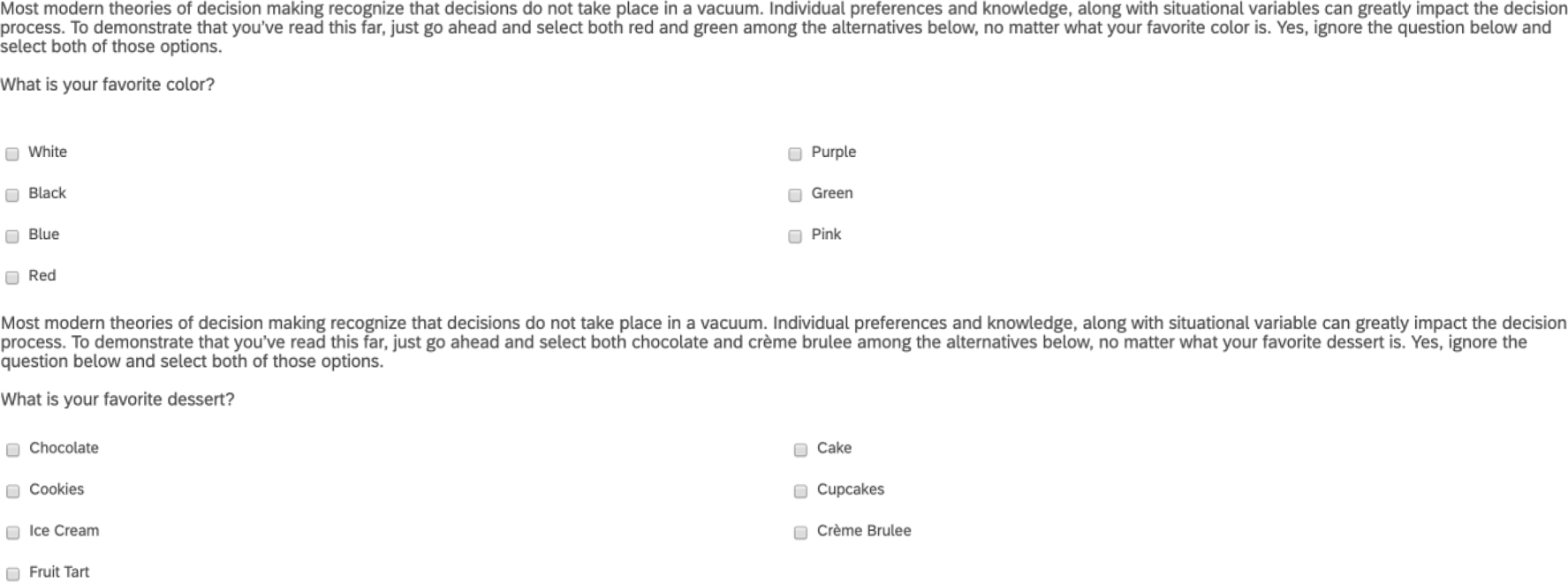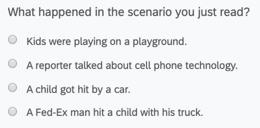 To detect VPN-use to hide participants’ lack of presence in the United States, the picture of eggplants was used to exclude participants suspected of not being in the United States. The name “aubergine” is used in the UK, Ireland, and France, and the name “brinjal” is used in South Asia. Sixty-three participants called the eggplants brinjal and thus were excluded.