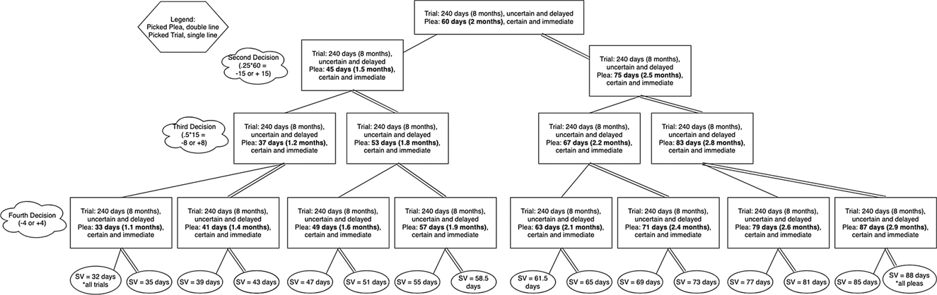 Each participant saw the top decision (with probability and delay specified instead of “uncertain and delayed”) and then, based on their response, they saw a second decision. If they selected the plea in the first decision, then they saw the second decision connected by the single line, running down to the left. If they selected trial in the first decision, then they saw the second decision connected by two lines, running down to the right. This continued for four decisions per delay, and then reset for the next delay, starting the participant back at the top of the decision tree, cycling through five times (once for each level of Delay until Trial).