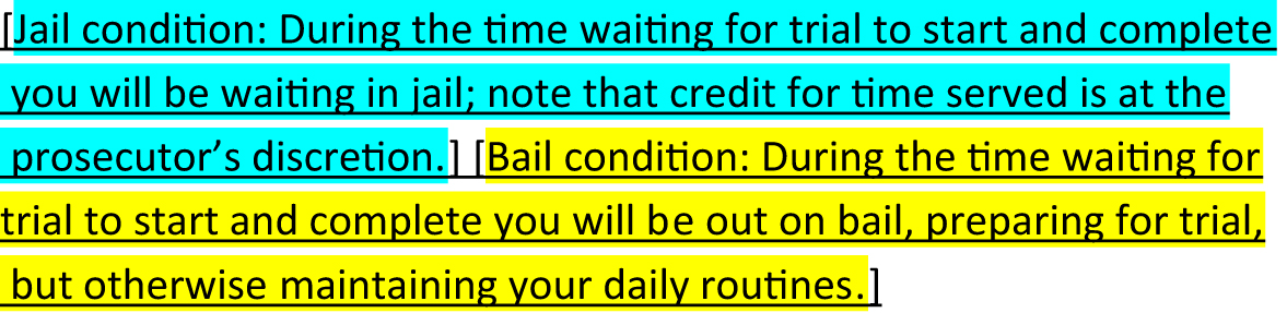 The text highlighted in blue is present only in Waiting-for-Trial Location’s Jail conditions. The text highlighted in yellow is present only in the Bail conditions, and nothing was present in that space in the Ambiguous conditions.