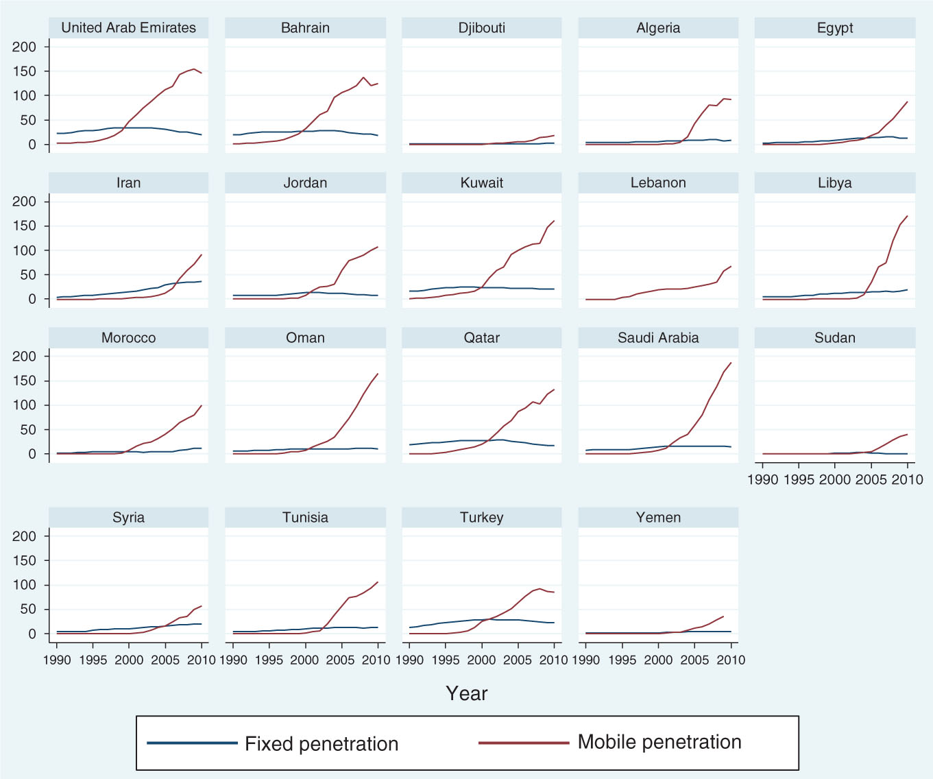 The aim of this paper is to study the occurrence of Fixed-Mobile Substitution (FMS) in the Middle East North African (MENA) region. While there have been many studies on developed countries, empirical evidence for developing countries is somehow limited. In the last few years, mobile cellular subscriptions achieved a tremendous growth across the MENA region making it the second fastest growing region in the world in terms of mobile subscriptions in 2012, and the fastest growing region in terms of mobile traffic in 2014. Fixed subscriptions have also grown but at a slower rate than mobile subscriptions. Using unbalanced data on 17 MENA countries over the period 1990–2009, we explore the relationship between fixed and mobile telephone services by using dynamic panel data models. We find empirical evidence for asymmetric one-way substitution between fixed-lines and mobile phones and we estimate own- and cross-price elasticities for fixed and mobile telephone services in MENA region. The results are then used to derive policy implications in terms of market redefinition, taxation policies, extension of universal services and broadband markets.