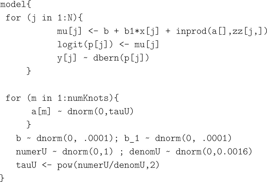 The model uses a Half-Cauchy prior for the variance of the coefficients for the penalized spline terms. Marley and Wand (2010) recommend these and in our experience, they work well, allowing the model to initialize and adapt with no problems, while being uninformative. Code to generate the O’Sullivan splines over the number of knots for the predictor x is available from Wand and Ormerod (2008). When there are κ internal knots the fitted number of degrees of freedom (df) is κ + 4.