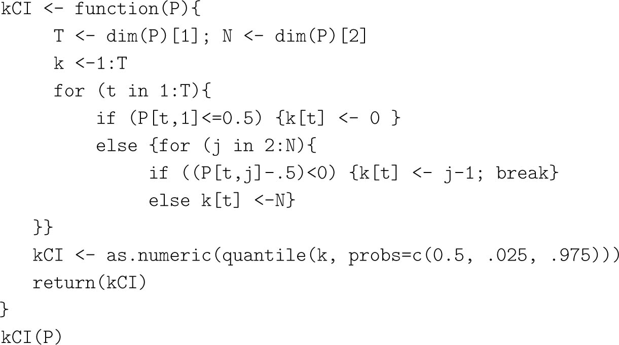 Let P=pjt be the matrix of posterior distributions for the pj. The dimensions of this matrix are the number of iterations, T, and N, the length of the agreement data. Then the code for post processing P to find k is given by the function kCI(P):