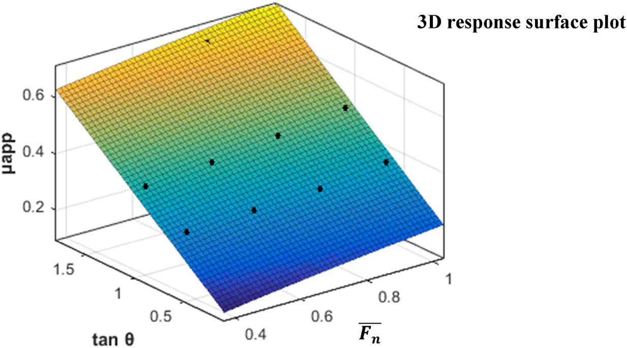 (8) μ app = μ plg + μ adh = A 2 π tan ( θ ) + B [ F n ̅ ] m ,