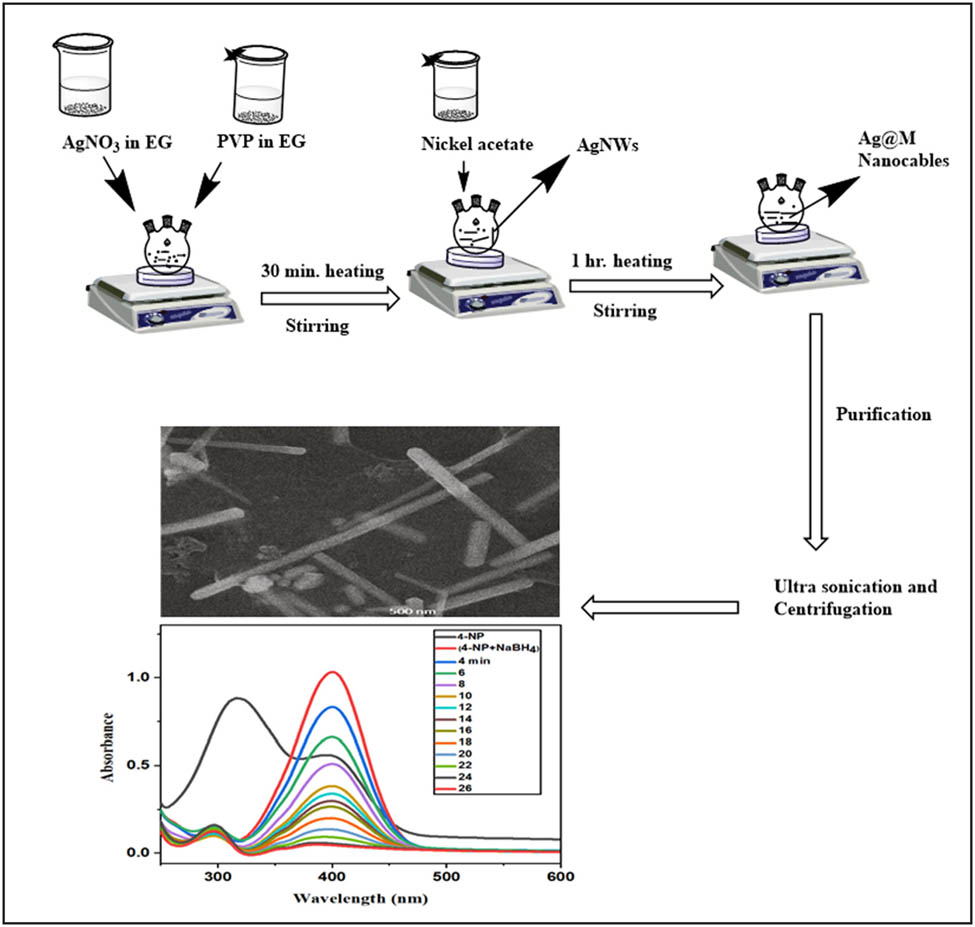 This study reports easily prepared Ag@Ni co-axial nanocable catalysts for the selective conversion of p-NP to p-AP by sodium borohydride which is more effective than many reported catalysts for this process [29]. This hybrid nanomaterial has been characterized by multiple physical techniques and its catalytic activity studied in detail.