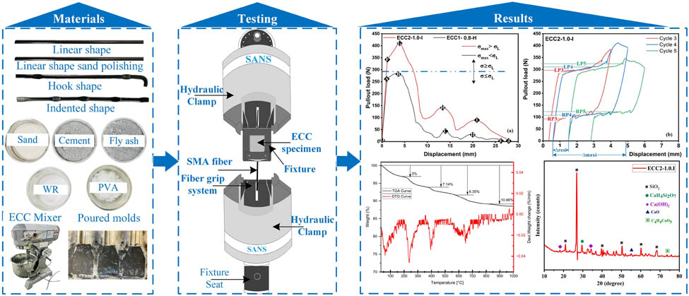 While previous research has explored the influence of fiber shape, cementitious materials, and the overall ECC matrix on the bond-slip behavior of superelastic SMAFs within cementitious ECC mixtures [38,39,47,48,49,50,51], a comprehensive and systematic investigation of pullout behavior in SMA fiber-reinforced engineered cementitious composite (SMAF-ECC) matrices remains limited. This study addresses this gap by introducing a novel SMAF design with unique geometries and surface treatment. The novelty of this research lies in its systematic investigation of the pullout behavior of SMAFs in ECC matrices. This study introduces new SMAF designs with unique geometries and surface treatments, addressing a critical gap in the current literature. This research evaluates the impact of these design modifications on bonding properties, interfacial behavior, and stress distribution within the ECC matrix. The integration of SMAFs with advanced concrete technology promises significant improvements in mechanical performance, crack management, and structural resilience. By exploring these novel SMAF designs, this study aims to enhance the practical application of SMAFs in high-performance concrete, offering valuable insights for future developments in civil engineering.