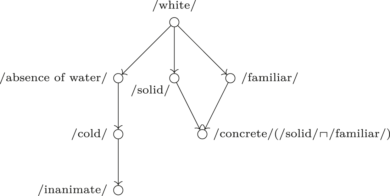 Here, we will to focus on the seme /white/ and the nominated dependent semes as they associate to the tokens (objects) {Image 1 (egg)} and {Image 4 (candle)} in B ̲ ( K 4 ) as well as signifiers {Word 3 ‘snow’ la Neige} and {Word 2 ‘moon’ la Lune} in B ̲ ( K 5 ) . As Bĕlohlévek and Sklenár̆ (2005: 180) note, in general, we can consider expressions within ADFs as terms over B in the form yt(y 1, …y n ). Here, we designate each attribute m ∈ M as a term, in addition to identifying terms through Booleans such as (t 1 ⊔ t 2). For example, we see in (38) that (/solid/ ⊓/familiar/) can be expressed as/concrete/(/solid/ ⊓/familiar/) given {/solid/, /familiar/}  = {/concrete/}.