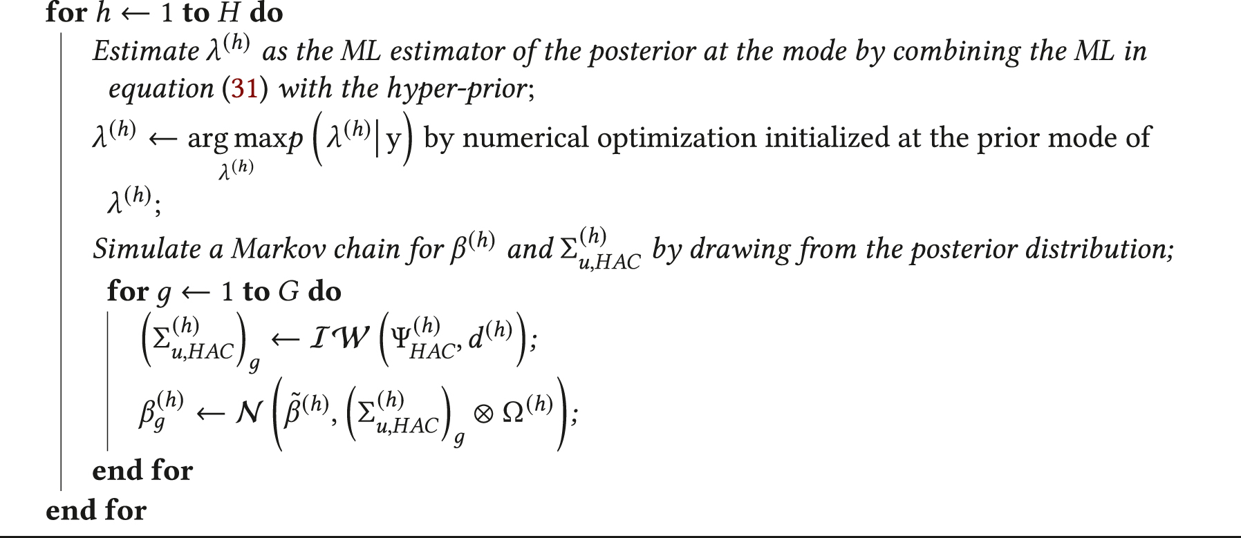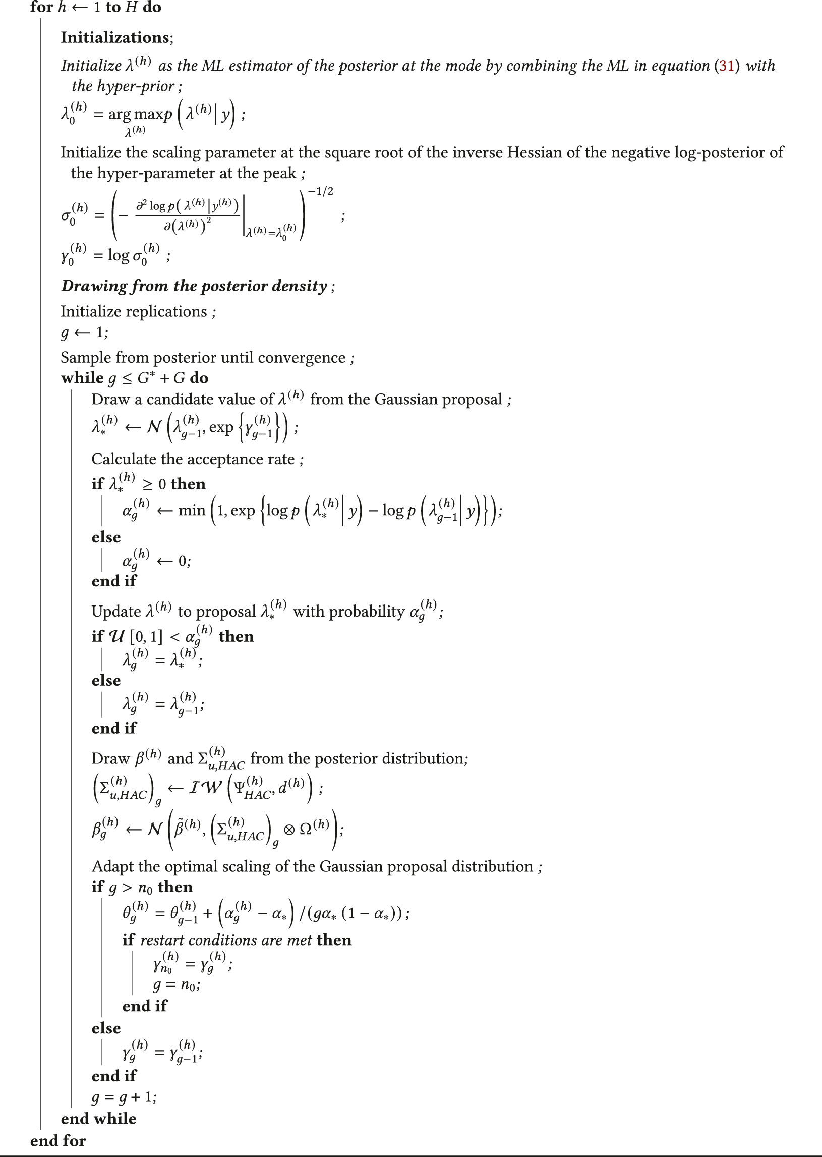 We follow Giannone, Lenza, and Primiceri (2015) and update the prior tightness parameter according to a Metropolis-Hastings algorithm, where at each iteration a candidate value is drawn from a Gaussian proposal with mean equal to the preceding value in the Markov chain,