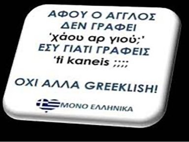 “SINCE THE ENGLISHMAN DOES NOT WRITE ‘χάου αρ γιού;’ [‘how are you?’] WHY DO YOU WRITE ‘ti kaneis;;;; [‘how are you’????] NO MORE GREEKLISH! [Greek flag in heart shape] ONLY GREEK” |