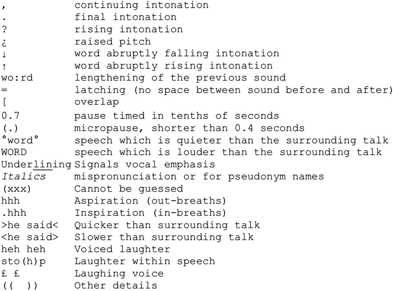 Jefferson, Gail. 2004. Glossary of transcript symbols with an introduction. In Gene H. Lerner (ed.), Conversation analysis: Studies from the first generation, 13–31. Amsterdam: John Benjamins.10.1075/pbns.125.02jefSearch in Google Scholar