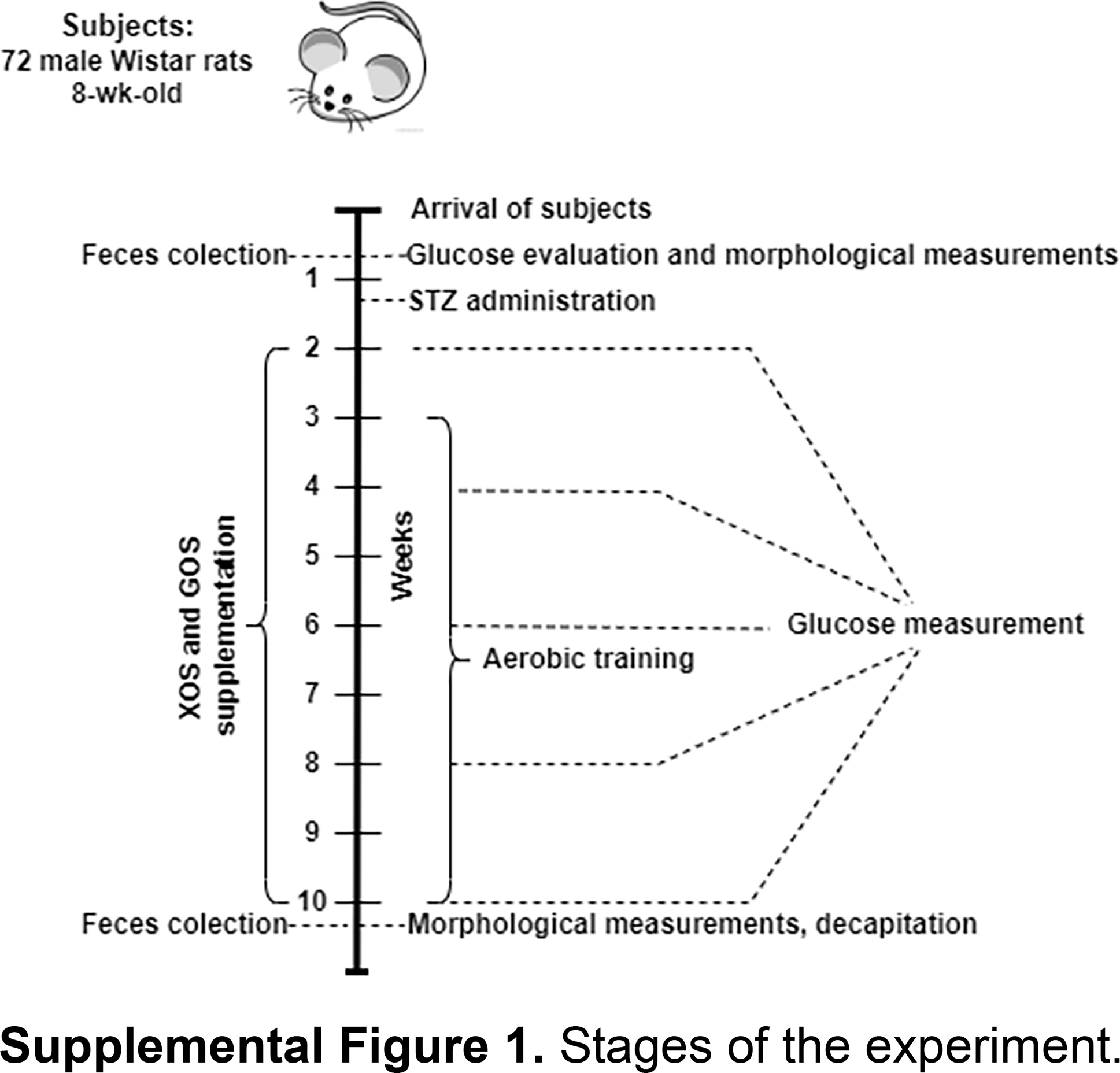 The present study was designed to evaluate the effect of two oligosaccharides – XOS and GOS, and of aerobic exercise on hyperglycemia and growth in streptozotocin (STZ)-induced diabetic rats. Furthermore, the diversity of the intestinal microbiota on species level was identified for the first time.