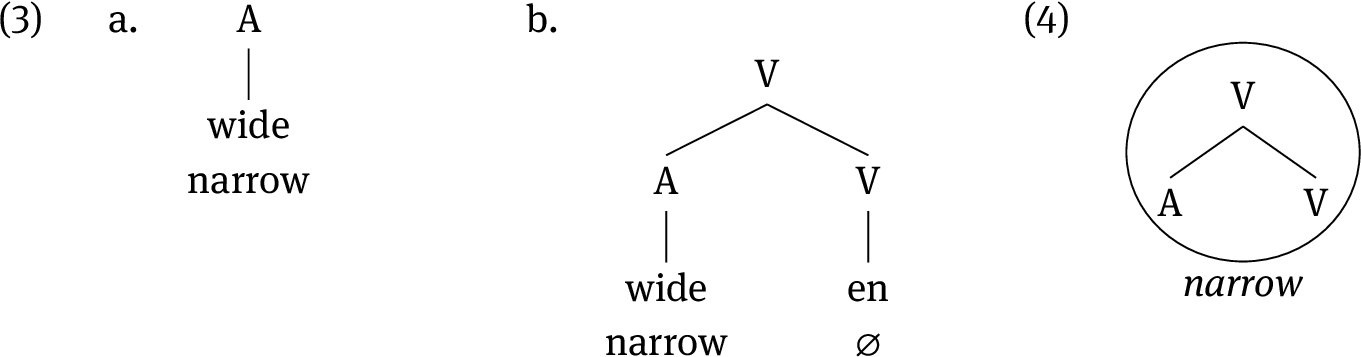 The next question is how the lexical entry of narrow can also realise the structure of an inchoative verb and an adjective. The phrasal-spellout model treats this as an instance of syncretism, i. e., different meanings expressed by the same form. Technically, this is achieved by proposing that lexical entries may lexicalise various different syntactic trees – under the condition that the syntactic tree is contained in the lexical entry. This condition is known as the Superset Principle: