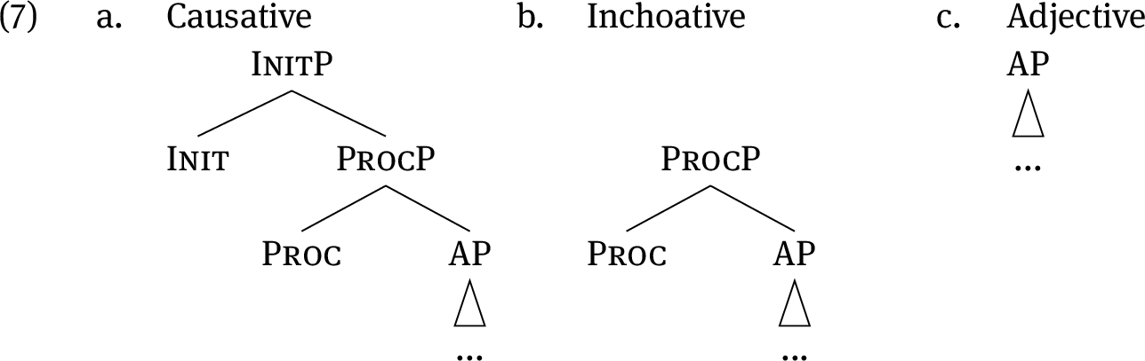 Against this background, Ramchand (2008: 90,108) analyses deadjectival verbs as in (7). The trees depict the structure of the causative, the inchoative and the adjective, respectively. Recall that each of Proc and Init brings along an argument position, which accounts for the argument-structure alternations.