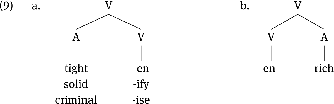 We start with morphological evidence in support of (8a). We have already discussed some of the evidence in Table 1, which shows how verbs are derived from adjectives by various affixes. The structural representation of these cases in (9) clearly shows how the verb is more complex than the adjective.