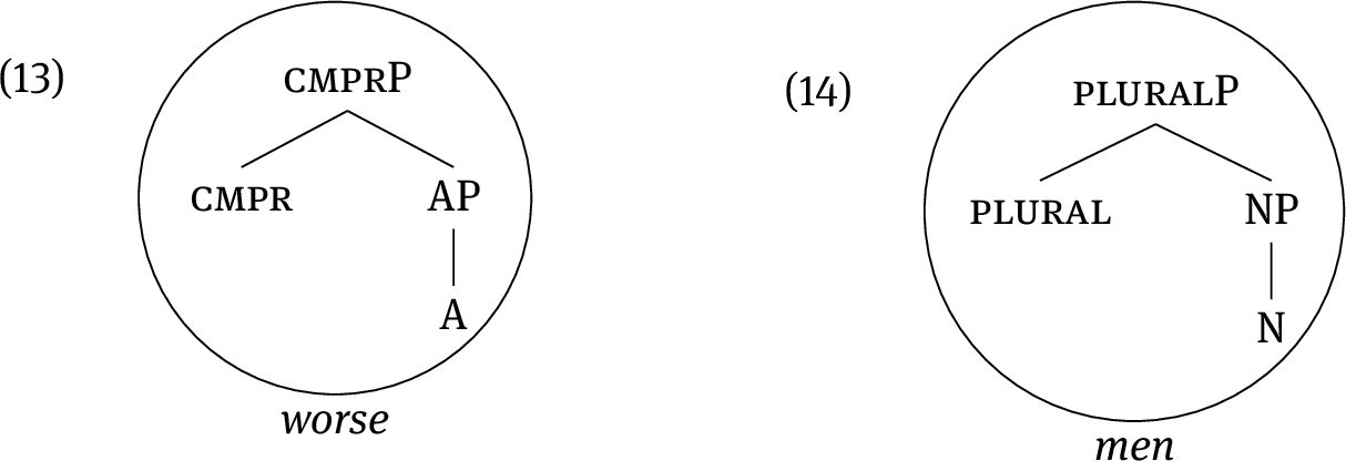 The idea that roots can (in addition to the conceptual meaning) also express adjacent grammatical categories is perhaps best seen in cases of root suppletion (bad–worse; man–men). These cases can be understood as instances of a scenario where the suppletive root realizes both the lexical category (A or N) and the relevant grammatical category (cmpr or plural). We show this in (13) and (14).