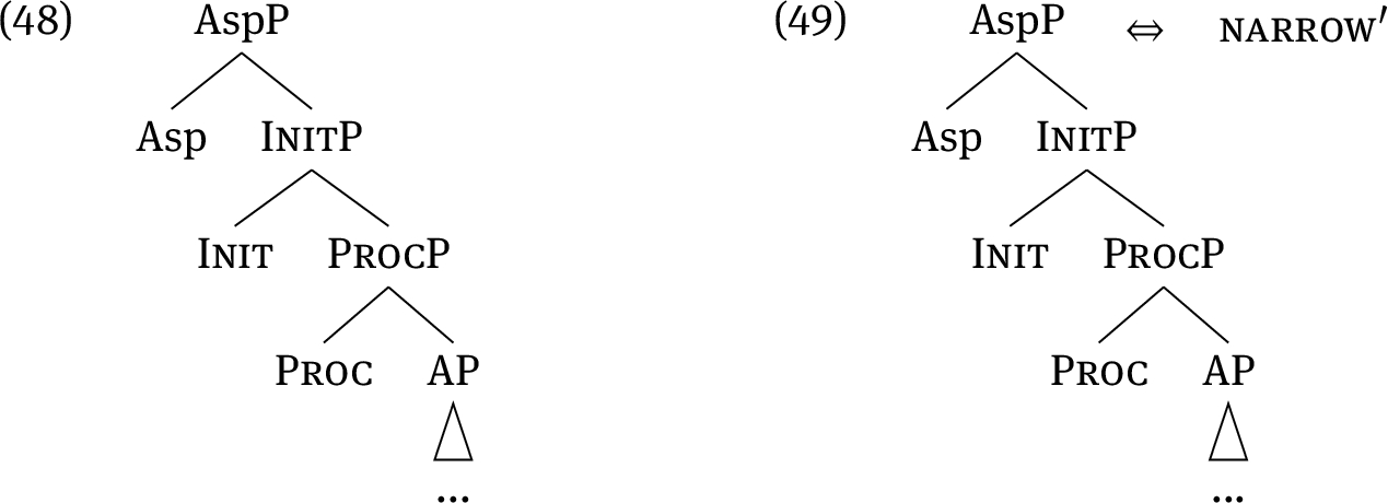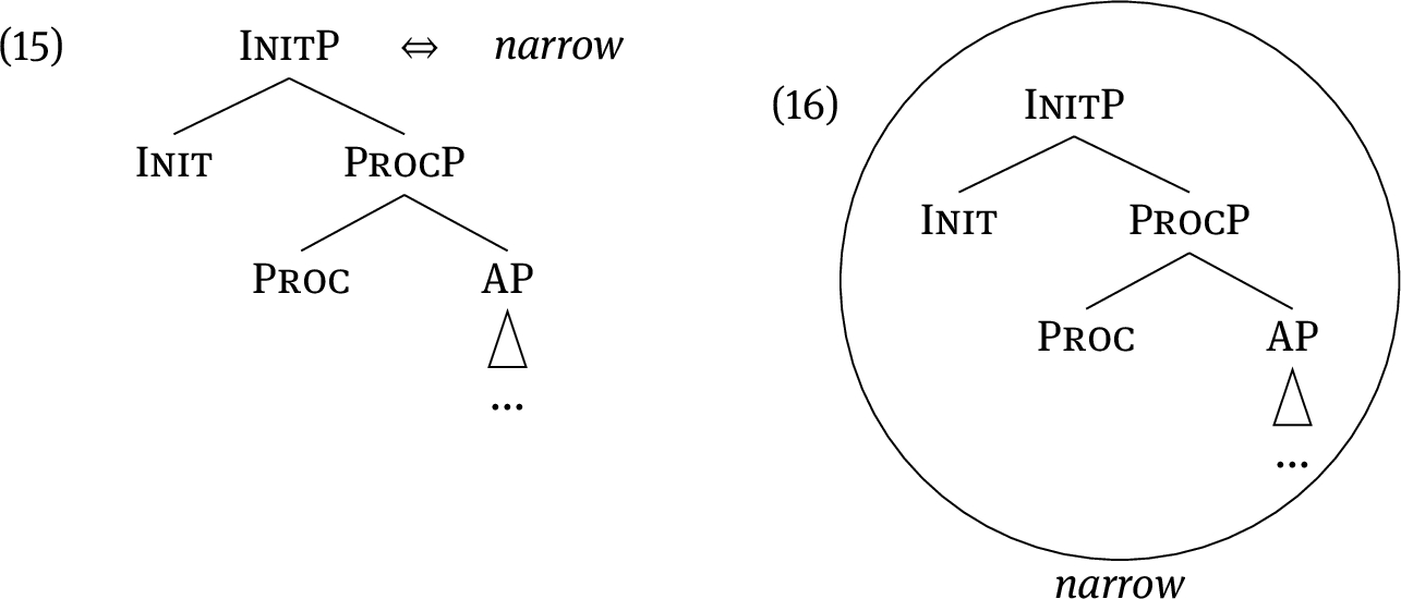 In Ramchand’s system, the causative in (7a) has an additional Init head, which introduces the Initiator argument. Verbs such as narrow in their causative use thus contain minimally two components of meaning that apparently receive no overt marking (i. e., Init and Proc).