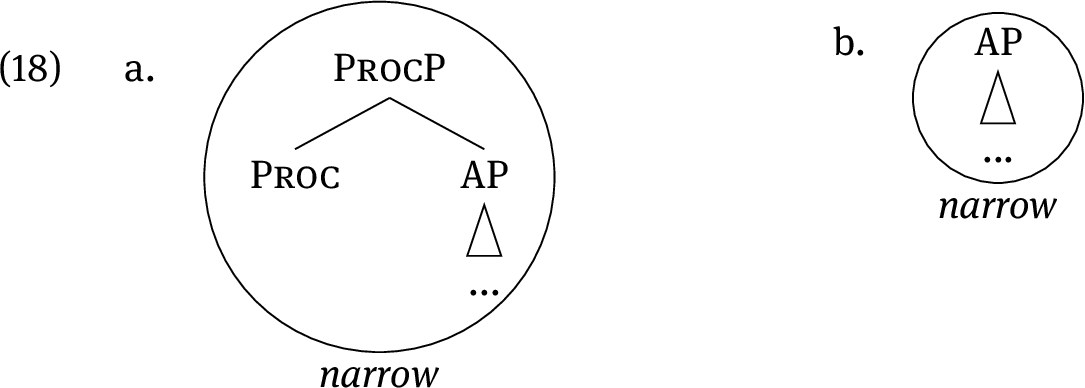 The result of adopting the Superset Principle is that the entry for narrow in (15) can also spell out the inchoative structure (18a) and the adjective structure (18b), because these trees are contained in (15).