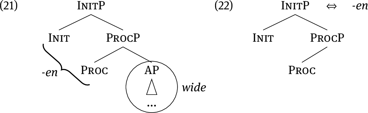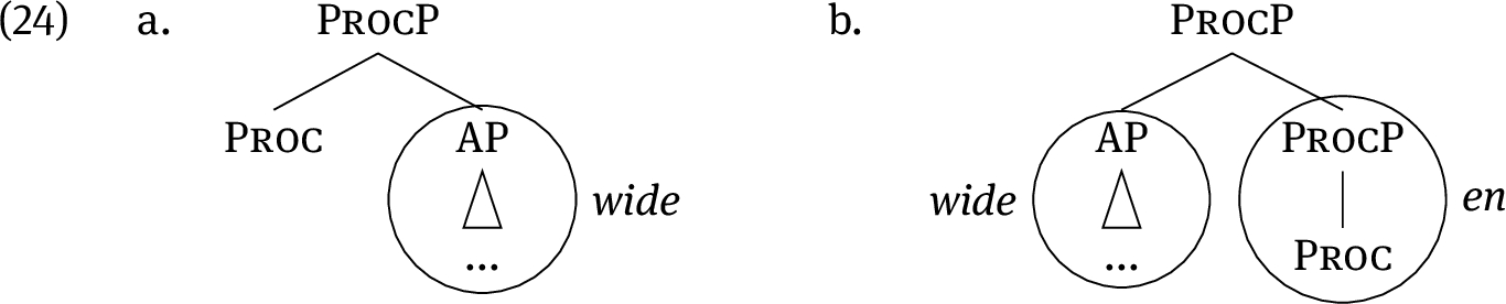The inchoative version of widen works analogously, except that the syntactic derivation lacks the init head, (24a). Movement of the AP to the left yields (24b). Since the remnant ProcP is a subtree of (22), -en can spell out the ProcP in (24b).